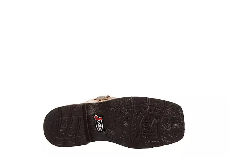You sure won’t look like a run-of-the-mill cowpoke in the Justin Starlina women’s Western boot. With a leather upper featuring embossed floral details on the shaft and a red lining for extra style, this pull-on boot also has a wide square toe for a roomier fit. The J-Flex Flexible Comfort System included a comforting removable orthotic insert while the traction sole and low block heel provide subtle lift and support.